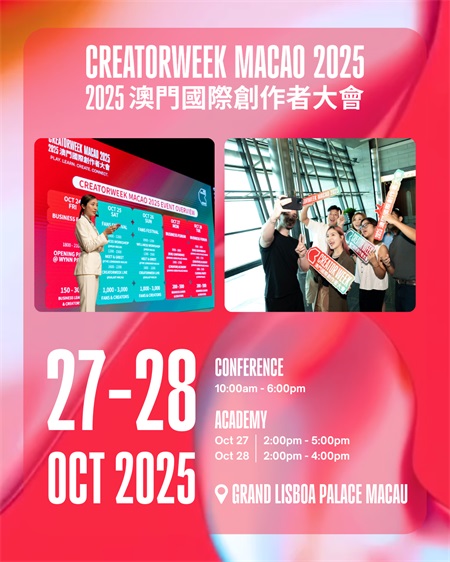 更多“CreatorWeek商業論壇”及“CreatorWeek創作者學院”活動資訊,請瀏覽“2025澳門國際創作者大會”官方網站www.creatorweek.live及旅遊局網站www.macaotourism.gov.mo或關注旅遊局官方社交媒體帳號。
