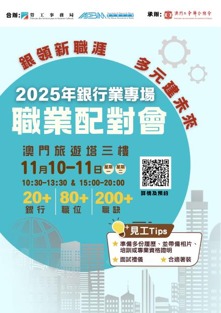 【本報訊】由勞工事務局和澳門銀行公會合辦,澳門工會聯合總會承辦的“2025年銀行業專場職業配對會”,將於2025年11月10日至11日一連兩日在澳門旅遊塔會展娛樂中心三樓舉行。是次配對會旨在為有意投身銀行業的本地居民提供就業對接平台,藉此培育及發展本地銀行業的人才。現場逾20間銀行參加,提供超過200個職位空缺,有意參加的澳門居民可由即日起至11月7日中午12時進行網上預約。