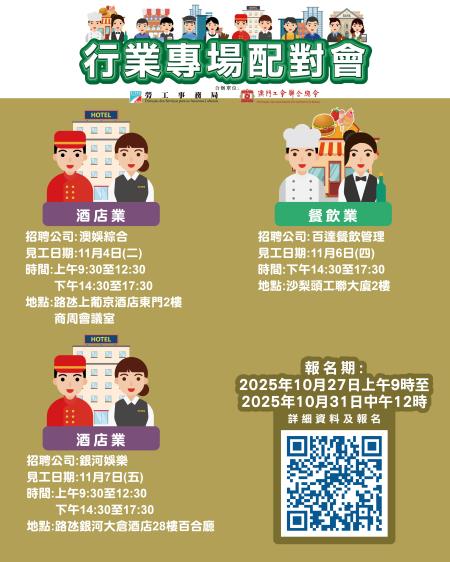 11月4日全日舉辦“澳娛綜合度假股份有限公司”專場配對會在上葡京二樓商周會議室舉行;11月6日下午舉辦“百達餐飲管理有限公司”專場配對會在澳門工會聯合總會二樓(沙梨頭海邊街2-6號工聯大廈二樓)舉行;11月7日全日舉辦“新銀河娛樂2006有限公司”專場配對會在大倉酒店28樓百合廳舉行。報名期由即日起至10月31日中午12時。