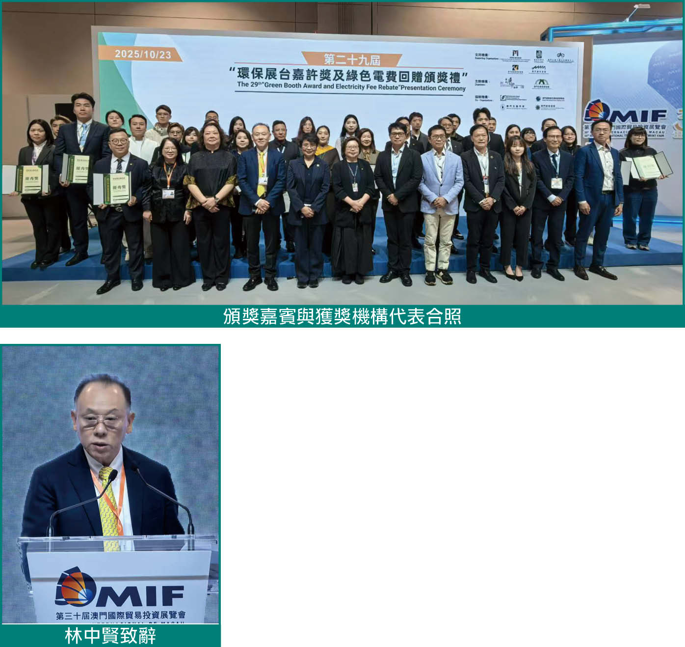 【本報訊】澳門展貿協會與澳門低碳發展協會合辦的第二十九屆環保展台嘉許獎及綠色電費回贈頒獎禮於十月二十三日在澳門國際投資貿易展覽會MIF期間舉行,由澳門招商局行政委員黃伊琳,澳門環保局環境宣傳教育處處長黃啟文,澳門生產力中心理事長關治平等嘉賓擔任主禮。