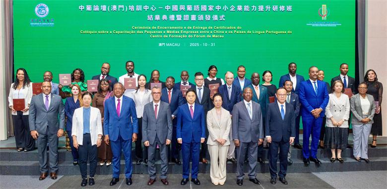 【本報訊】10月31日,由中國—葡語國家經貿合作論壇(澳門)常設秘書處主辦的“中國–葡語國家中小企業能力提升研修班”在澳門旅遊塔舉行結業典禮暨證書頒發儀式。本次研修班為期兩周,於10月19日至11月2日在澳門舉辦,有來自安哥拉、佛得角、幾內亞比紹、莫桑比克、葡萄牙及中國的14名相關領域官員、技術員和機構高管參加。