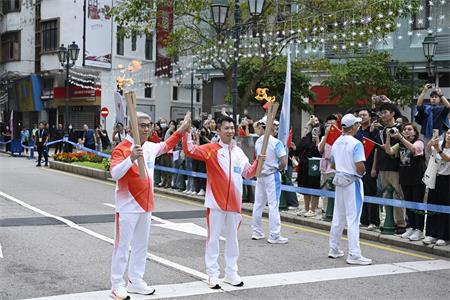 及後,岑浩輝與出席火炬傳遞活動的嘉賓及50位火炬手在大三巴牌坊前合影,離開時與沿途觀看火炬傳遞的市民和旅客握手問好,親切交談。