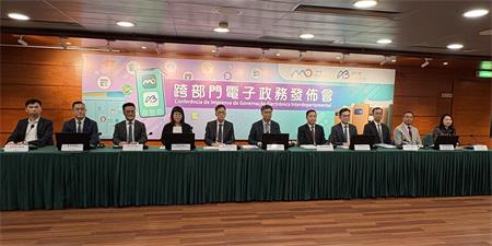 【本報訊】特區政府聯合各相關部門今(4)日上午10時於水坑尾公共行政大樓11樓舉行跨部門電子政務發佈會。行政公職局陳子健副局長、郵電局施贊禮代處長、交通事務局羅家明處長、社工局張景輝代廳長、市政署何菁華廳長、法務局盧瑞祥副局長、橫琴粵澳深合區商事服務局彭九如副局長、教青局林文達廳長、治安警察局黃劍虹廳長、金融管理局蔡浩明副總監、經科局羅芷敏處長出席發佈會。