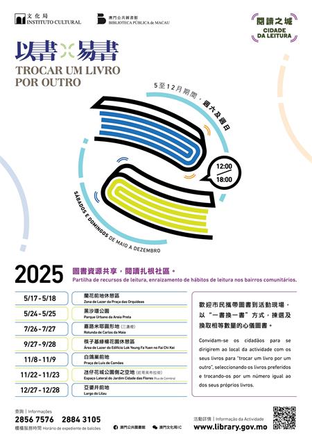 新增場次將於1189日在白鴿巢前地、122728日在亞婆井前地舉行,連同早前已公佈的112223日在氹仔花城公園旁空地之場次,各場活動時間為中午12時至下午6時。活動採取“一書換一書”形式,參加者只需攜帶符合換書規則的書籍前往現場,經工作人員確認後,即可挑選並換取等量的心儀圖書。現場亦設澳門公共圖書館服務展板,方便市民瞭解各項圖書館資源與服務。
