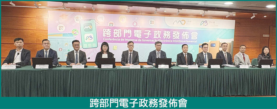 【本報訊】特區政府聯合各相關部門4日上午10時於水坑尾公共行政大樓11樓舉行跨部門電子政務發佈會。行政公職局陳子健副局長、郵電局施贊禮代處長、交通事務局羅家明處長、社工局張景輝代廳長、市政署何菁華廳長、法務局盧瑞祥副局長、橫琴粵澳深合區商事服務局彭九如副局長、教青局林文達廳長、治安警察局黃劍虹廳長、金融管理局蔡浩明副總監、經科局羅芷敏處長出席發佈會。