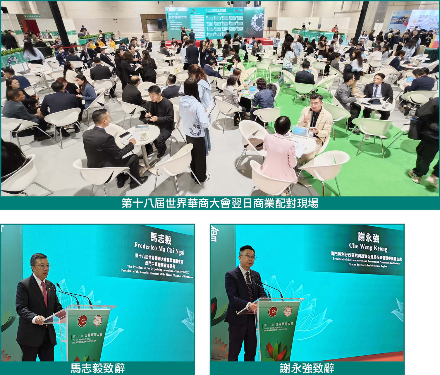 謝永強致辭表示,商業配對作為大會的重點活動之一,期望能促進世界各地華商與澳門企業之間的交流與合作,共同拓展環球市場,發掘更多合作機遇的同時,促進澳門經濟適度多元發展。