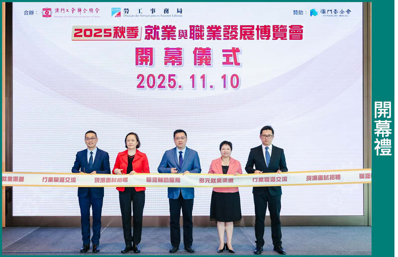 【本報訊】由工聯總會與勞工事務局合辦,澳門基金會贊助秋季“就業與職業發展博覽會”於1110一連兩天在旅遊塔四樓舉辦,開放時間為上午10時至下午130分及下午3時至晚上8時。市民可透過現場排隊領取籌的方式入場求職。澳門中聯辦社工部處長孫志君、澳門基金會行政委會副主席鍾怡、勞工副局長陳子慧、工聯副會長李振宇、深度合作區民生事務局社會保障處副處長林君凡主禮開幕禮。