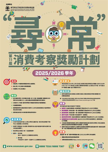 【本報訊】消費者委員會舉辦的第11屆“尋・常”消費考察獎勵計劃(下稱“尋・常”計劃)現正接受報名,報名截止日期至125日,歡迎全澳中學生組隊參加。