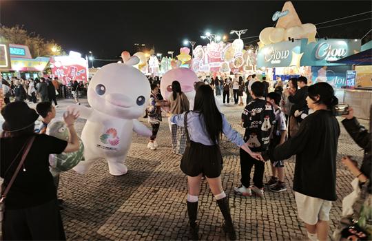 美食節顧客與現場“十五運會”吉祥物互動合照