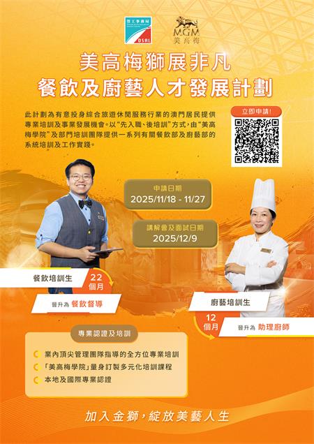 【本報訊】為促進本地人才職業發展,勞工事務局(下稱“勞工局”)和美高梅金殿超濠股份有限公司(下稱“美高梅”)合作推出“美高梅獅展非凡餐飲及廚藝人才發展計劃”(下稱“計劃”),以“先入職、後培訓”方式,為本澳居民提供專業培訓及工作實踐,計劃由明(18)日起接受申請。