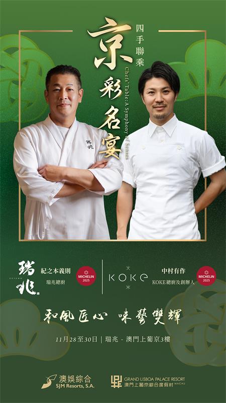 【本報訊】澳娛綜合度假股份有限公司(“澳娛綜合”)將於11月28日至30日呈獻“‘京’彩名宴”日系篇章,迎來兩家米芝蓮星級餐廳“瑞兆”及“KOKE”的首度聯袂。是次美饌盛會以“和風匠心・味藝雙輝”為主題,精選日本直送的深秋與初冬時令食材,在傳統割烹的深邃底蘊與創意和洋的破格靈感之間,讓賓客領略日本料理精準細膩、一絲不苟的職人精神。