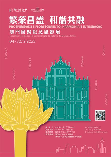【本報訊】為慶祝澳門回歸祖國廿六周年,由澳門基金會主辦的“繁榮昌盛 和諧共融——澳門回歸紀念攝影展”將於2025年12月4日(星期四)18:30在澳門新口岸宋玉生廣場澳門教科文中心展覽廳及多功能廳正式開幕。