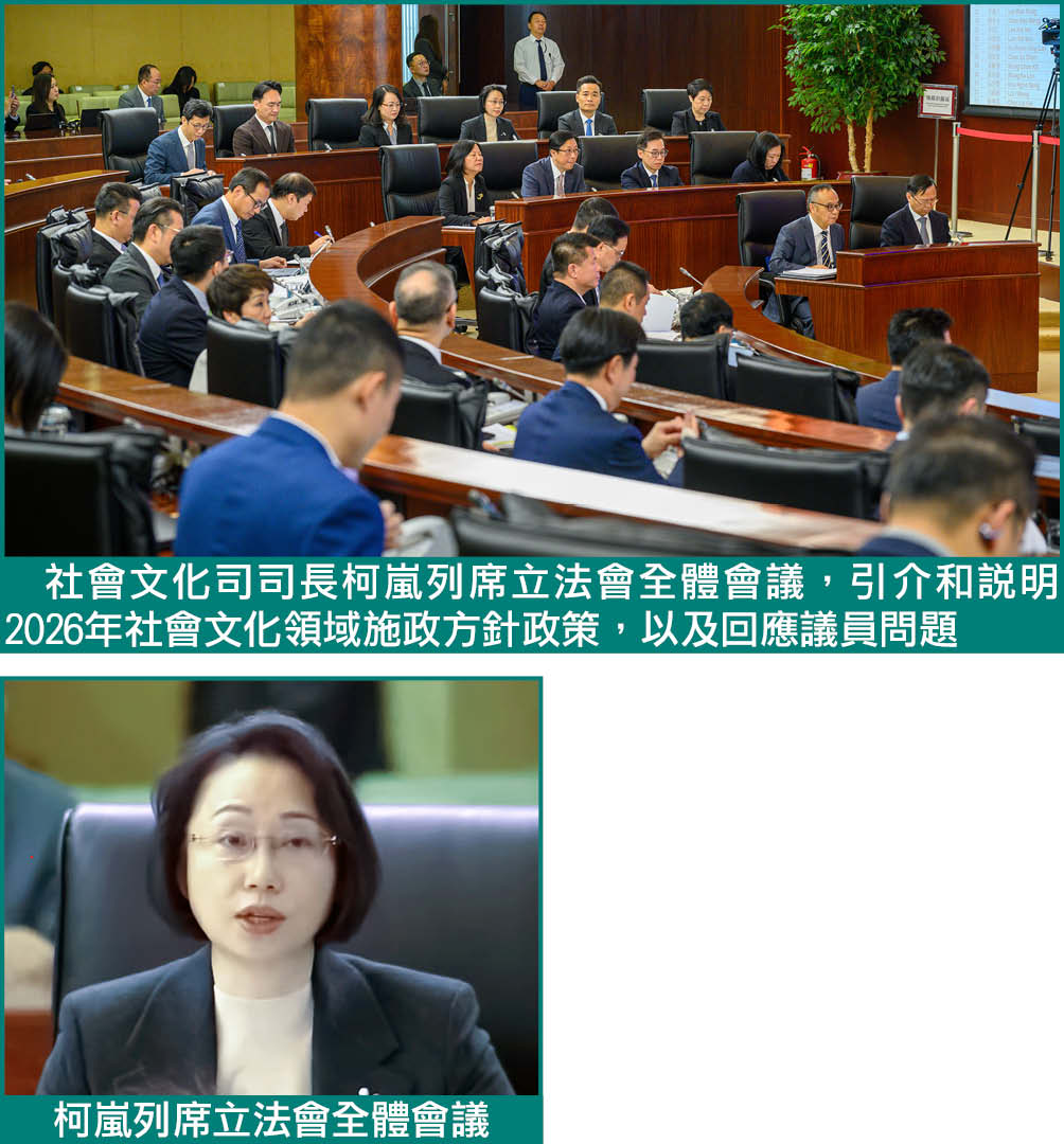 【本報訊】社會文化司司長柯嵐11月28日列席立法會,引介2026年財政年度社會文化司範疇施政方針及回答立法議員的提問。柯嵐在引介中指出,2025年是本屆政府的開局之年,在行政長官的領導下,社會文化範疇施政團隊與其他範疇緊密協作,推動各項工作創新發展。