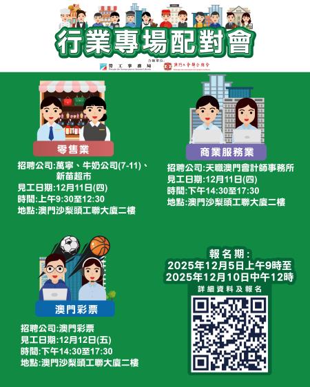 12月11日上午零售業專場配對會、12月11日下午“天職澳門會計師事務所”專場配對會及12月12日下午“澳門彩票有限公司”專場配對會,均在澳門沙梨頭海邊街2-6號工聯大廈二樓舉行。報名日期均由明(5)日上午9時起至12月10日中午12時。