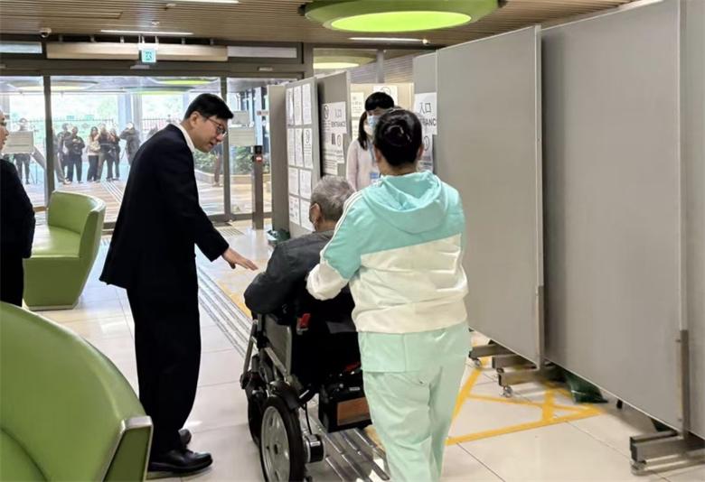 香港特區政府勞工及福利局局長孫玉菡一早便來到這裡視察,不時停下和長者寒暄,俯身仔細詢問他們的投票體驗。當聽到有長者竪起大拇指稱贊“流程好順暢,有人幫忙不慌張”時,他笑著回應:“大家滿意,我們就放心了。”