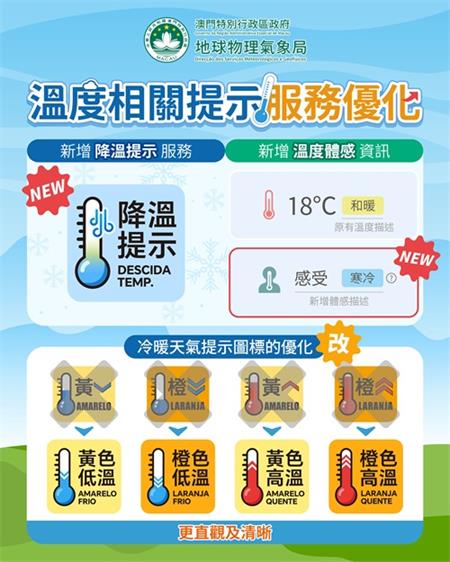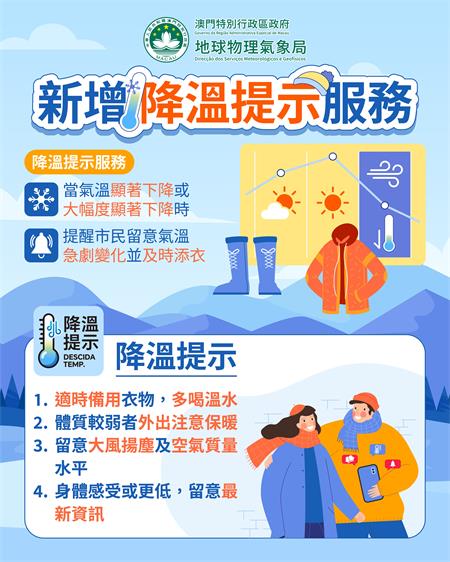 “降溫提示”主要針對本澳秋冬季的氣候特點,當預測氣溫顯著或大幅顯著下降時,氣象局將提前發出降溫提示,為市民提供更豐富多元和及時的氣象資訊,讓公眾能提前採取適當預防措施,減少顯著降溫天氣對健康造成的影響。