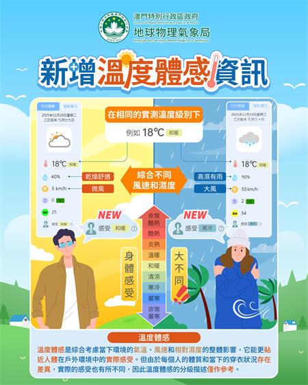 “溫度體感”將為市民提供更貼近實際感受的實時氣象資訊。該資訊結合實時氣溫、濕度、風速等氣象要素,計算出當刻天氣狀況下,一般人在戶外環境中較常出現的實際感受,並據此調整衣著及活動安排。無論是日常出行、戶外工作或休閒活動,市民均可透過此資訊獲得更實用的氣象參考,進一步提升生活品質。
