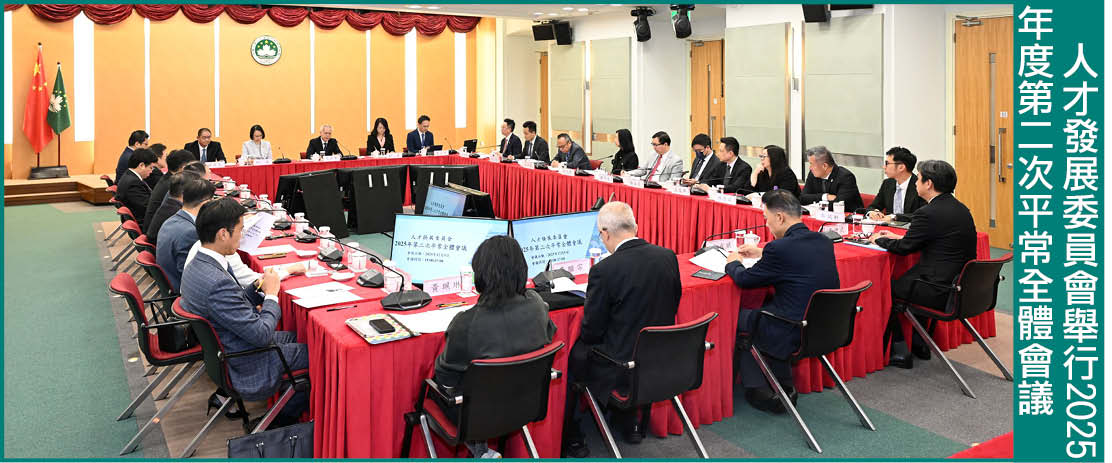 【本報訊】人才發展委員會2025年度第二次平常全體會議於12月5日在政府總部多功能廳舉行,會議由人才發展委員會主席、行政長官岑浩輝主持,委員會副主席、社會文化司司長柯嵐介紹人才工作的方向,委員會秘書長龔志明及副秘書長黃健武進行匯報。