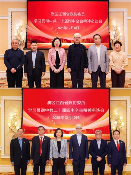 【本報訊】2025年12月8日及10日,澳區江西省政協委員在澳門舉行“學習貫徹中共二十屆四中全會精神座談會”。座談會旨在全面學習和深刻領會四中全會精神,切實把思想和行動緊隨國家部署,為紮實推進中國式現代化建設、支持國家事業穩步前進凝聚共識、貢獻力量。出席委員包括:澳區常委龐川、陳志玲,委員潘永權、丁清河、黃昆水、呂子安、胡峰、葉鐘文、冷鐵勳、鄭成昌、和線上參加的施芳遠。