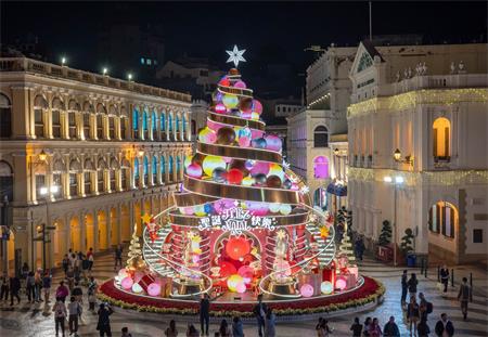當中於議事亭前地除佈置大型燈光隧道外,還安裝了一組色彩繽紛的大型聖誕樹,以金色蝴蝶結為主軸,堆疊各式各樣彩球;樹兩旁以旋轉樓梯作點綴,周邊配置禮物盒、彩球以及造型可愛的聖誕老人及小精靈,增添了趣味和節慶感。另外,於澳門科學館亦可見到聖誕老人乘坐太空船降落的座地燈飾;氹仔中央公園則配置了多個造型可愛聖誕角色的聖誕樹、各類燈光裝置及聖誕吊飾;運動場圓形地以遊樂園為主題,透過聖誕老人、雪人、薑餅人等,傳遞歡樂溫馨的氣氛。
