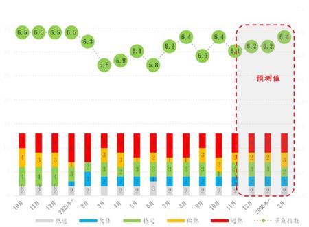 十月受黃金週帶動,本澳綜合旅遊休閒相關的主要指標:入境旅客、酒店住客與入住率皆進入“偏熱”或“過熱”區間;博彩毛收入保持穩中向好,十月、十一月的日均博彩毛收入升至7.77及7.03億澳門元,帶動整體服務業的節奏明顯加快;總就業人數持續攀升,失業率進一步降至1.7%,屬“低失業率”等級,反映人力需求仍相當旺盛。與此形成對比的是,反映市場預期與投資意願的領先指標仍未同步升溫。企業與居民在面對外部不確定性時仍偏向保守,內地消費者信心指數停留在“低迷”水平,本地居民貸存比持續向下。六大休企股價在“欠佳”區間徘徊,反映資本市場對仍抱持審慎態度;而住宅樓價指數延續低迷。經綜合指標數據的分析及推算,十月至十一月的經濟景氣指數分別為6.4分及6.1分,整體維持在“穩定”等級。