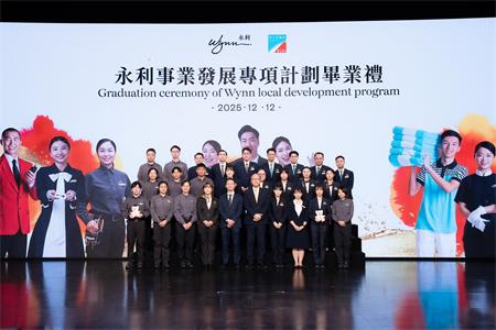 “永利事業發展專項計劃2025”採用“先入職、後培訓”模式,為學員提供為期12至36個月的專項培訓旅程,涵蓋管事部、餐飲、廚藝、設施管理及前堂服務等領域。今年計劃進一步擴大規模,全年共招募了67位學員。在典禮上,勞工事務局及永利管理層代表共同主持啟動儀式,並向新一期學員致送紀念品,鼓勵他們開啟職涯新篇章。同場亦舉行“永利事業發展專項計劃2024”結業儀式,向上屆28位畢業學員頒發結業證書和紀念品,他們在完成課程後均獲得晉升機會,部分更獲擢升至主任或相若職級,充份體現永利致力推動本地人才向上流動的承諾。
