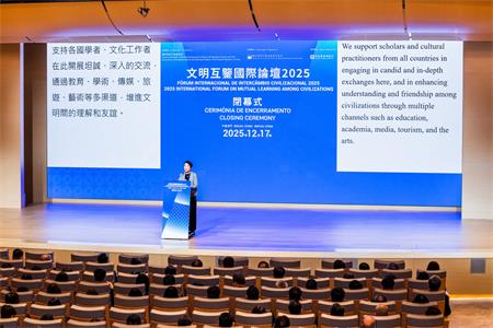 文化局局長梁惠敏於閉幕致辭中表示,中華文明歷來重視“和而不同”與“協和萬邦” 的價值體系,為跨文化理解提供有益的參照框架。是次論壇落戶澳門,別具意義。今年適逢“澳門歷史城區”成功列入《世界遺產名錄》二十周年,這片融合中葡文化印記的城區提供了文明互鑒的生動範例。依託“一國兩制”優勢,澳門正努力建設國家高水平對外開放的重要橋頭堡和中西文明交流互鑒的重要窗口。論壇的豐碩成果,將為中華文明與世界多元文明的對話貢獻澳門力量。