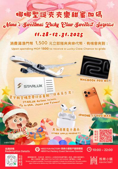 由即日起至1231日,澳門葡京人H853 Fun Factory娛樂小鎮攜手原創IP角色娜娜推出娜娜聖誕夾夾樂甜蜜加碼購物獎賞活動,為訪客帶來更具吸引力的節慶禮遇,訪客憑兩張於H853 Fun Factory娛樂小鎮內不同商戶之當日有效消費單據(每張最低消費額為澳門幣50元),兩張單據合計滿澳門幣1,500元,即有機會贏取星宇航空機票、iPhone 17 Pro Max、等豐富禮品,為節日消費增添更多驚喜。