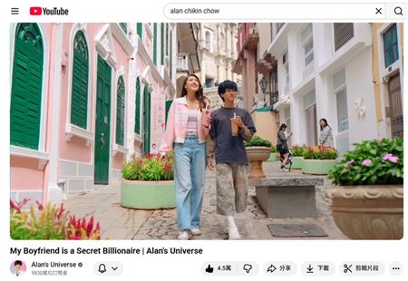 【本報訊】旅遊局與全球YouTube Shorts觀看量排名第一的創作者Alan Chikin Chow合作推出創意短劇,期望借助創作者的國際影響力,將澳門獨特的城市風貌與文化魅力,以輕鬆幽默的敘事方式呈現給全球Z世代年輕觀眾,持續拓展國際年輕客源市場。