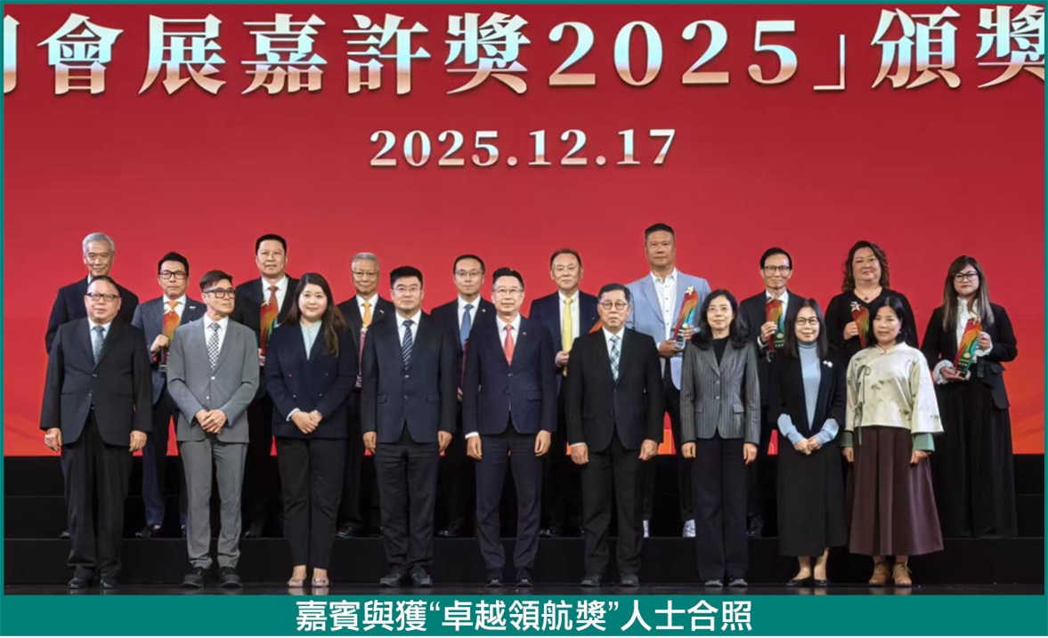 粵澳名優商品展獲得卓越會展大獎;第二十三屆品牌消費嘉年華、亞洲國際娛樂展2025、第十一屆澳門工展會獲得品牌展覽獎;2025澳門Magic Meeting漫嘉年華、亞洲綜合度假休閒產業博覽會、2025永利臻典夢幻超跑展獲得創新展覽獎;第十八屆國際知識科學、工程與管理會議(KSEM 2025)、第十八屆杯芳烴國際會議暨第八屆葫蘆脲國際會議聯合會議(JCCC2025)獲得議競投獎;慶祝2025年東亞文化之都:中國澳門活動年銀河娛樂澳門城市文化嘉年華“世界定向PWT國際邀請賽暨南粵古驛道定向大賽(中澳門站)”獲得創意盛事獎;第四屆中國(澳門)國際高品質消費博覽會暨橫琴世界灣區論壇獲得澳琴“一會展兩地”貢獻獎;金柏國際展覽運輸(澳門)有限公司、天職澳門會計師事務所、澳門旅遊塔會展娛樂中心、美高梅、澳門永利渡假村、建同市場推廣(澳門)有限公司獲得會展優質服務獎。