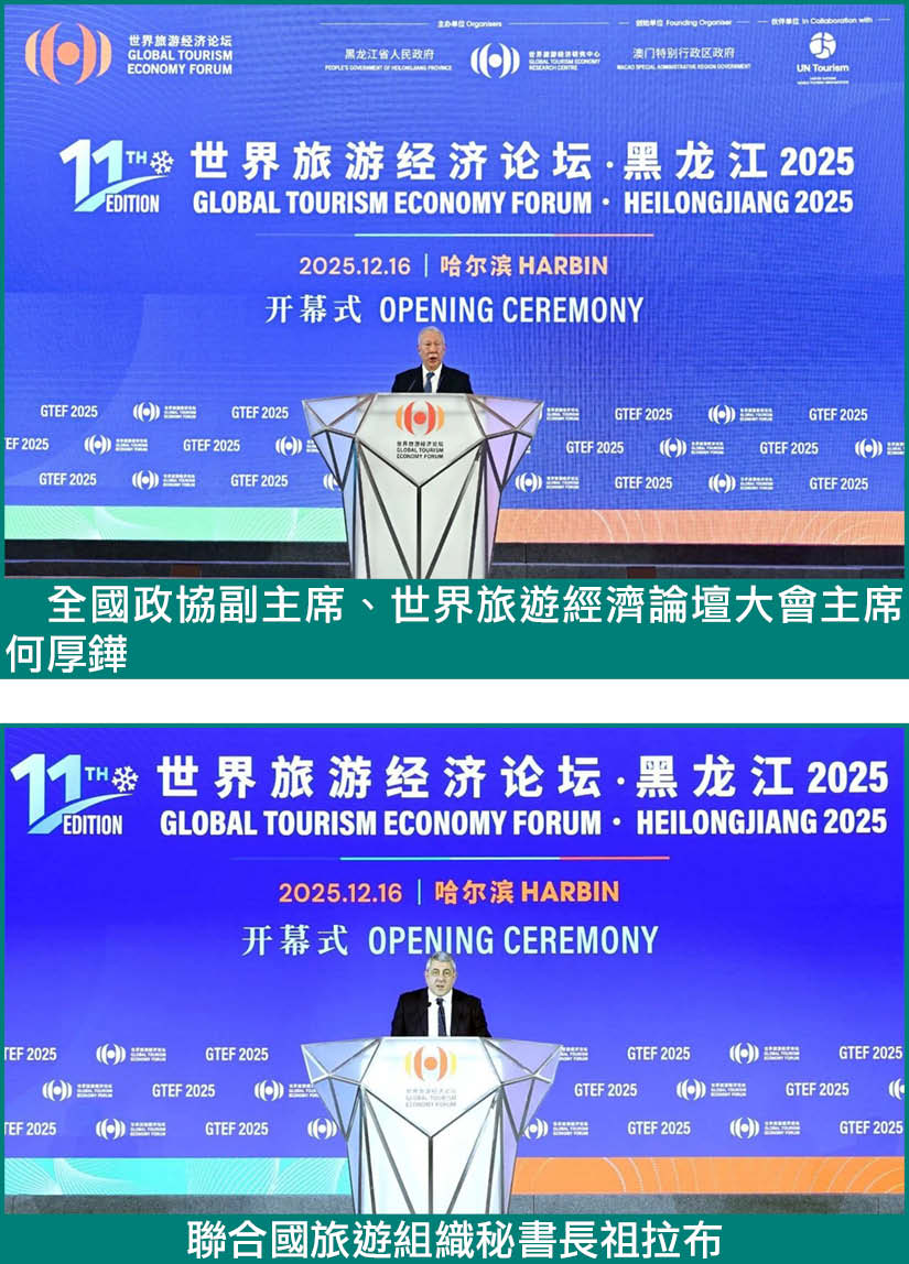 全國政協副主席、世界旅遊經濟論壇大會主席何厚鏵發表開幕致辭。他說:“本屆論壇從澳門‘移師’黑龍江,是一次深具遠見的戰略升級。我們以‘新質生產力:世界旅遊經濟新引擎’為主題,與當前正徐徐展開的國家‘十五五’規劃中,強調發展新質生產力、構建現代化產業體系的方向高度契合。而黑龍江,正是詮釋這一主題的最佳地域,這裡不僅是新質生產力重要論述的戰略起點,更是這一創新理念開花結果的熱土。我深信,我們在此彙聚的智慧與達成的合作協定,必將為中國以至全球旅遊經濟的可持續與高品質發展,注入強勁而持久的動力。”