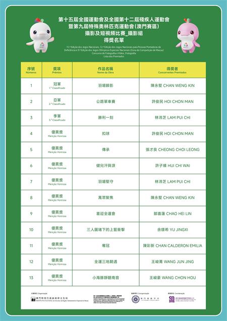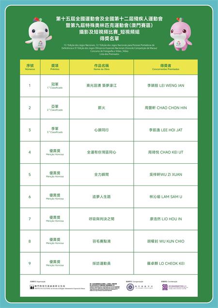 【本報訊】為響應“第十五屆全國運動會及全國第十二屆殘疾人運動會暨第九屆特殊奧林匹克運動會(澳門賽區)”(下稱“十五運會及殘特奧會”)在澳門特別行政區舉辦賽事,由文化局與十五運會及殘特奧會澳門賽區籌備辦公室聯合主辦、澳門攝影學會協辦的“十五運會及殘特奧會”攝影及短視頻比賽已圓滿結束,比賽收到約200份參賽作品,經評審團評選,現公佈冠軍、亞軍、季軍及優異獎得獎名單。