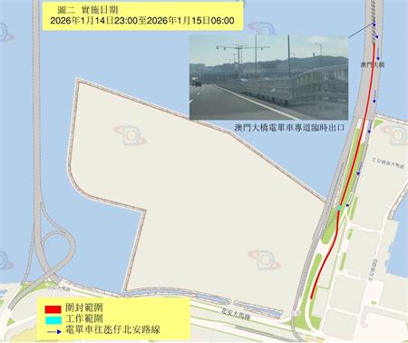 2026114日晚上11時至翌日上午6時,澳門A區往氹仔的電單車道氹仔出口將臨時封閉,電單車駕駛者可於電單車專道道近氹仔端的一段位置駛入汽車車道前往氹仔。(詳見圖2