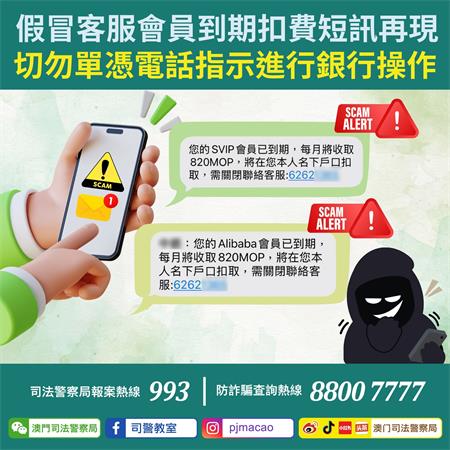 警情通告:假冒客服會員到期扣費短訊再現 切勿單憑電話指示進行銀行操作