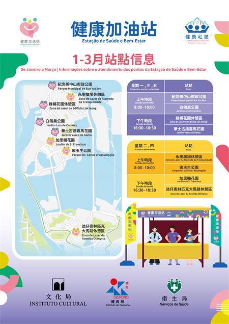 隨後,一眾嘉賓前往現場設立的“健康加油站”,了解運作情況並與居民互動交流,氣氛熱烈。“健康加油站”首階段活動於1月12日至3月31日期間,逢星期一至五(政府假日、惡劣天氣及維護期間除外)上午8:00至10:00及下午16:30至18:30,於紀念孫中山市政公園、白鴿巢公園、綠楊花園休憩區、華士古達嘉馬花園、永寧廣場休憩區、宋玉生公園、加思欄花園及氹仔奧林匹克大馬路休憩區共八個站點同步開展,敬請留意開放時間。各站配有“健康加油站”橫額,工作人員亦會佩戴相關胸針,以便居民識別。文化局、體育局及衛生局將分別派出“文化傳播員”、“健身指導員”及“健康促進員”,為居民提供文化活動指導與資訊、個性化科學運動指導、免費血壓測量、健康資訊與評估,並協助預約衛生中心醫療服務,包括疾病篩查、疫苗接種、心理評估等多項內容。
