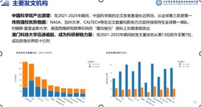 上圖展示了2016-2025年全球主要研究機構在月球科學領域的科研產出趨勢。發文量顯示:中國科學院近五年的論文發表量(橙色柱)增長近兩倍,從全球第三躍居第一;傳統頂尖機構(如NASA、加州大學)保持領先規模;澳科大發文量排名從第13位大幅躍升至第7位,躋身世界前十。“篇均被引”則反映了各機構論文的平均影響力表現。