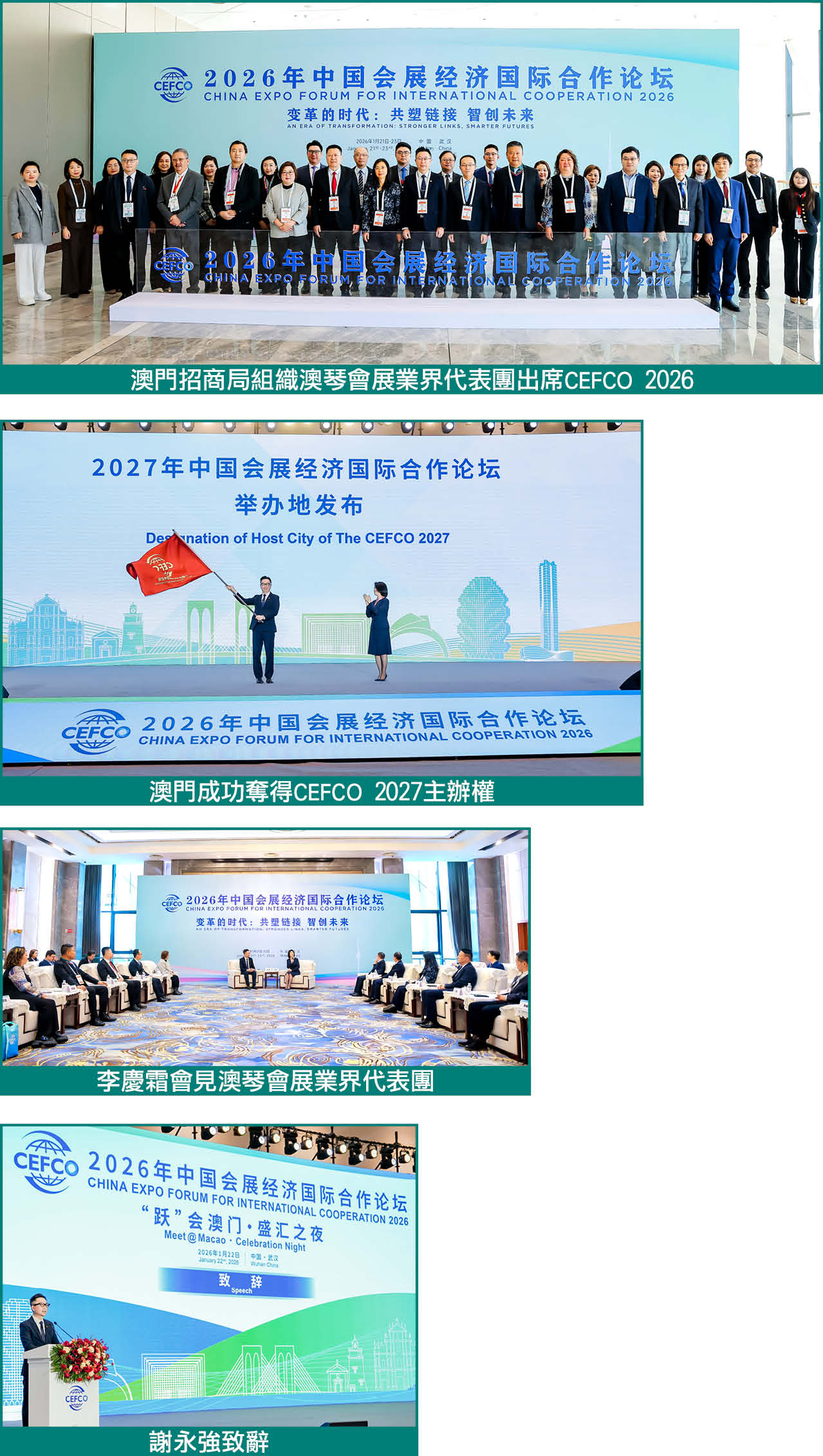 【本報訊】日前,澳門特區招商投資促進局(下稱“澳門招商局”)組織澳琴會展業界代表團赴武漢出席“2026年中國會展經濟國際合作論壇”(CEFCO 2026),期間主辦方正式宣佈澳門再度奪得2027年主辦權,成為首個二度舉辦CEFCO的城市。活動歷屆於全國巡迴舉行,時隔十年重臨澳門,再次肯定澳門作為優質會展目的地的實力。此外,在上周剛舉辦的“第20屆中國會展產業交易大會”上,澳門獲頒最具影響力會展目的地獎項,是澳門首次獲得該殊榮。2026年開局之初,澳門會展業界接連獲得重要項目及優異獎項,發展勢頭強勁。