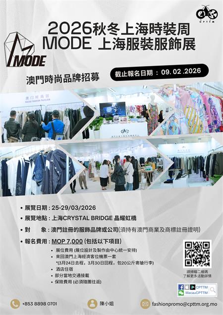 【本報訊】為推動澳門時尚行業發展,助力業界開拓市場,澳門生產力暨科技轉移中心(下稱“生產力中心”)將於2026秋冬上海時裝周—MODE上海服裝服飾展設立“澳門館”,現正公開招募本澳時尚品牌參展,歡迎符合資格的品牌申請。