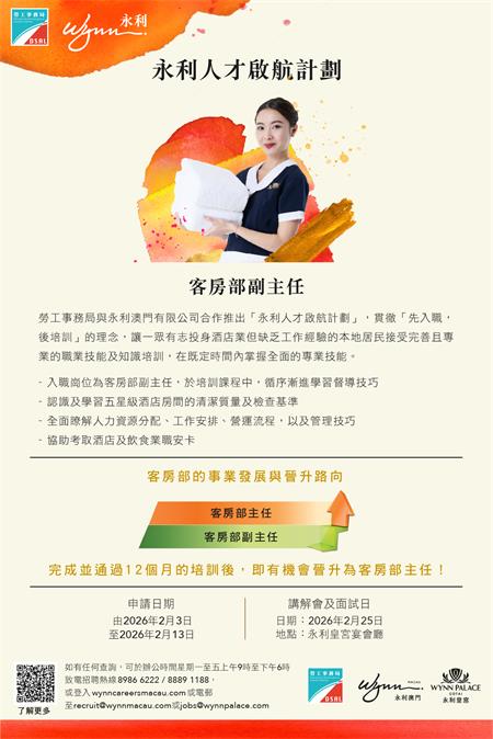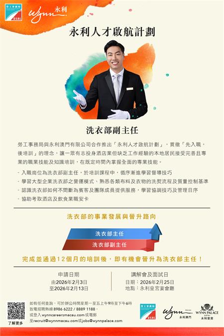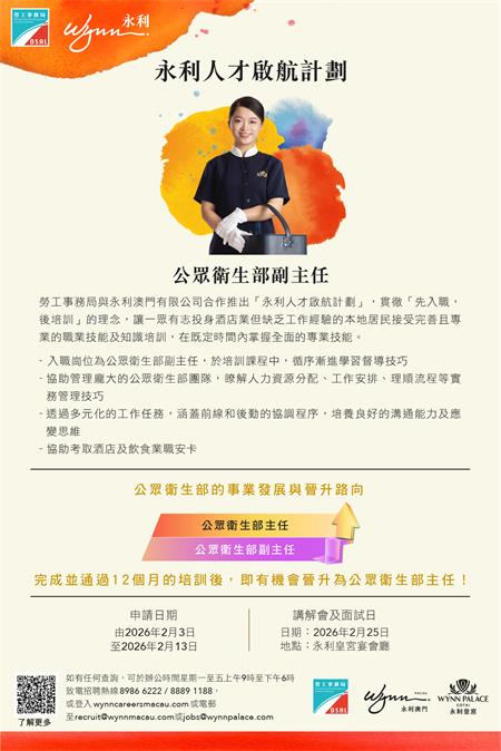 澳門居民如欲了解計劃詳情,可登入勞工局網站內相關專頁:https://www.dsal.gov.mo/zh_tw/standard/wynn2026_careerdevelopment_programme1.html,有意參加者可於明(3)日起至2月13日期間網上遞交申請。申請期結束後,永利將陸續通知符合條件的申請人,參加2月25日舉行的講座,隨即安排面試,詳細說明計劃的各項培訓內容及職業生涯發展路徑。