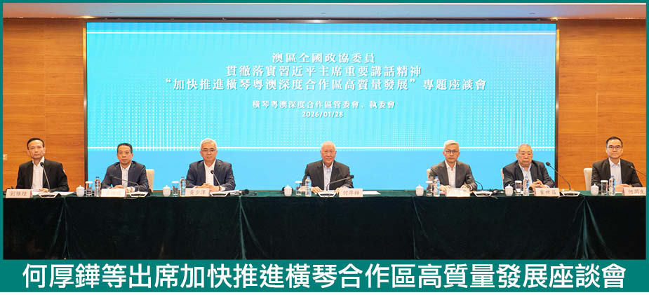 【本報訊】橫琴粵澳深度合作區管委會、執委會日前在澳分別與澳區全國人大代表、澳區全國政協委員舉行座談會,就貫徹落實習近平主席重要講話精神、加快合作區高質量發展聽取意見建議。全國政協副主席何厚鏵,澳門中聯辦副主任、全國政協常委黃柳權,全國人大常委高開賢,澳區全國人大代表團團長劉藝良,合作區管委會常務副主任黃少澤,執委會主任戴建業、副主任符永革、李翀、曹晉鋒、張國基和各機構負責人,以及澳門特區政府各範疇代表出席座談會。