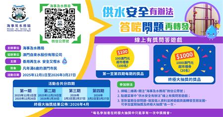 “供水安全有辦法”分四期進行,設有每期抽獎及終極大抽獎,獎品豐富。歡迎市民即日起至227日參加第三期活動。凡答對五條問題、正確填寫個人資料,並將遊戲頁面分享至微信朋友圈的參加者,便可符合當期抽獎和終極大抽獎的資格,有機會獲得超市禮券。有興趣的市民可到“澳門海事及水務局”微信公眾號參與活動和了解詳情。