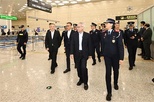 最後,岑浩輝抵達橫琴口岸視察離境大廳及汽車通道,先後聽取治安警察局代局長伍素萍、保安部隊事務局局長劉運嫦、海關助理關長葉華釗的口岸工作匯報,了解節假日期間的口岸通關情況、人潮管制方案、“刷臉”智能通關運作及擴建通道規劃、車道貨檢和旅客通關查驗等各項工作安排。