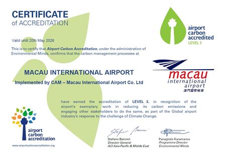 在所有機場持份者積極攜手努力下,澳門國際機場已成功於2025年11月獲升級為第三級別認證。展望未來,澳門國際機場將持續與社區、持份者及機場營運商積極應對氣候變化,共同爭取更進一步的減排措施,促進澳門航空業界可持續穏建發展,以實際行動支持全球的減排目標及國家的“雙碳目標”。