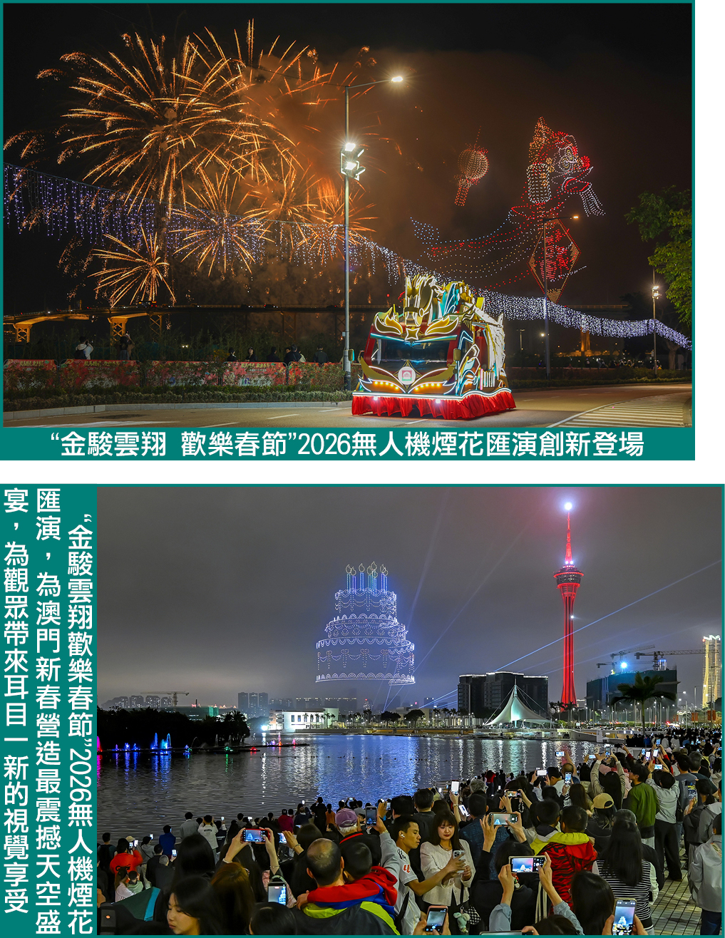 首度推出的“金駿雲翔歡樂春節”2026無人機煙花匯演同日晚上於旅遊塔對出海面上演,採用3,888架無人機結合煙花、音樂與雷射效果,約15分鐘的演出以生肖馬與新春祝福為主題,融合創新科技與傳統節慶元素,增強演出的層次感與觀賞性,豐富節慶體驗。第二亦於年初七(2月23日)晚九時在旅遊塔對出海面絢麗舉行,歷約廿五分鐘。第三場無人機煙花匯演場次及正月十五(3月3日)晚上9時再度在旅遊塔對出海面絢麗舉行。