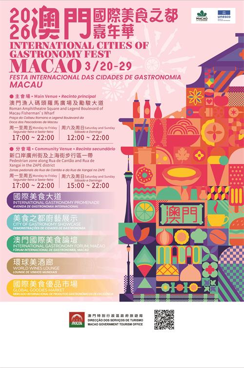 “2026澳門國際美食之都嘉年華”於3月20至29日舉行,主會場選址新口岸區的澳門漁人碼頭羅馬廣場及勵駿大道,首次設置的分會場則位於廣州街及上海街一帶。來自全球近40個聯合國教科文組織“創意城市美食之都”的代表聯同10個來自海內外其他範疇創意城市的代表、專家學者、澳門旅遊業及餐飲業界,合力擦亮“國際美食大道”、“美食之都廚藝展示”、“澳門國際美食論壇”以及全新登場的“環球美酒廊”和“國際美食優品市場”,打造全方位的美食與交流體驗。