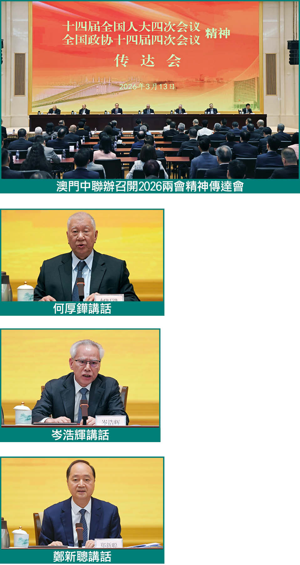 【本報訊】313日下午,中央政府駐澳門聯絡辦公室召開2026年全國兩會精神傳達會。全國政協副主席何厚鏵、澳門特別行政區行政長官岑浩輝、中央政府駐澳門聯絡辦公室主任鄭新聰分別講話,崔世安先生、賀一誠先生出席。澳門地區全國人大代表團團長劉藝良、全國政協常委崔世昌分別傳達十四屆全國人大四次會議、全國政協十四屆四次會議精神。外交部駐澳門特派員公署特派員卞立新,中央政府駐澳門聯絡辦公室副主任呂玉印、張應傑參加。