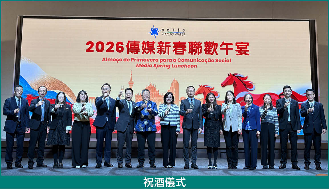 【本報訊】澳門自來水17日於旅遊塔舉辦“2026傳媒新春聯歡午宴”,邀請本地及駐澳傳媒代表齊聚一堂,旨在加強與傳媒的雙向交流,答謝各界傳媒長期以來對澳門供水服務的關注與支持,同時借助傳媒橋樑,及時反饋市民關切的供水議題,推動供水服務持續優化。並宣佈今年年中將在橫琴首次承辦以“水潤灣區 智向未來”為主題的第七屆粵港澳大灣區水務論壇暨第十六屆深港珠澳供水界學術交流會。