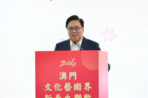 吳志良會長發表致辭並回顧澳門文總2025年的工作成績,他表示2025年是澳門文化界聯合總會成立後穩步發展的關鍵一年。澳門文化界聯合總會完善十六個專業委員會機制,設立常態化協調機制,積極服務會員。“澳門文化社團服務中心”將於今年下半年掛牌。組織赴內地參展、赴韓國簽署合作備忘錄、在巴西出版《人民文學》葡語版,並主辦大灣區文藝峰會機制澳門年會及文投大會,搭建政府與業界橋樑。2026年是國家“十五五”規劃開局之年,從“融入國家大局”到“融入和服務國家發展大局”,對澳門文化工作提出更高要求。文總將凝聚業界力量,堅守中華文化立場,保護傳承澳門文化遺產;推動“文化+科技”融合,鼓勵創作創新;發揮中葡平台優勢,以國際化語言講好中國故事,面向華裔新生代傳播中華文化,助力澳門建設中外文化交流合作基地。