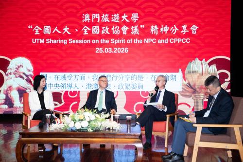 【本報訊】澳門旅遊大學在325日舉行“全國人大、全國政協會議”精神分享會,邀請澳區全國人大代表團副團長、立法會議員崔世平;澳區全國人大代表、全國人大常委會澳門特別行政區基本法委員會委員黃顯輝;以及全國政協委員、澳門旅遊大學校長黃竹君擔任主講嘉賓。三位嘉賓圍繞“十五五”規劃重點、青年人才培養等議題展開深入交流,並勉勵師生深刻領會兩會精神,積極融入國家發展大局。分享會共吸引約400名學生及教職員在線上線下共同參與,場面熱烈。