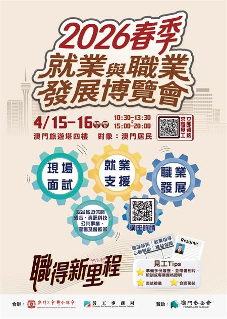 【本報訊】勞工事務局與澳門工會聯合總會將於4月15日至16日一連兩日假澳門旅遊塔會展娛樂中心四樓,合辦“2026春季就業與職業發展博覽會”(下稱博覽會)。有意參加的澳門居民可由3月31日起至4月13日進行網上預約。